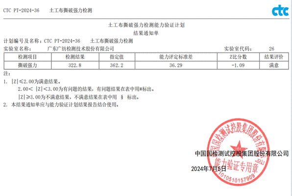 近日,廣東廣紡檢測技術(shù)股份有限公司收到中國國檢測試控股集團(tuán)股份有限公司組織的CTC-PT-2024--36土工布撕破強(qiáng)力檢測能力驗證計劃滿意結(jié)果通知單。